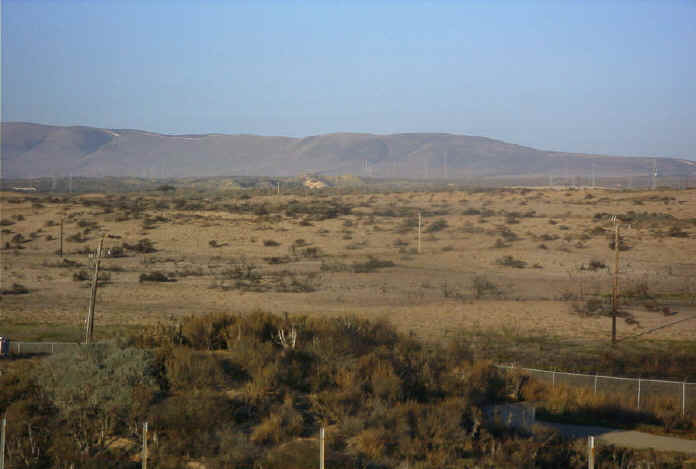 MAIN ACCESS ROAD WITH INNER FENCE AND GATE NOTE: LAUNCH AND SERVICE BUILDING ON FAR LEFT